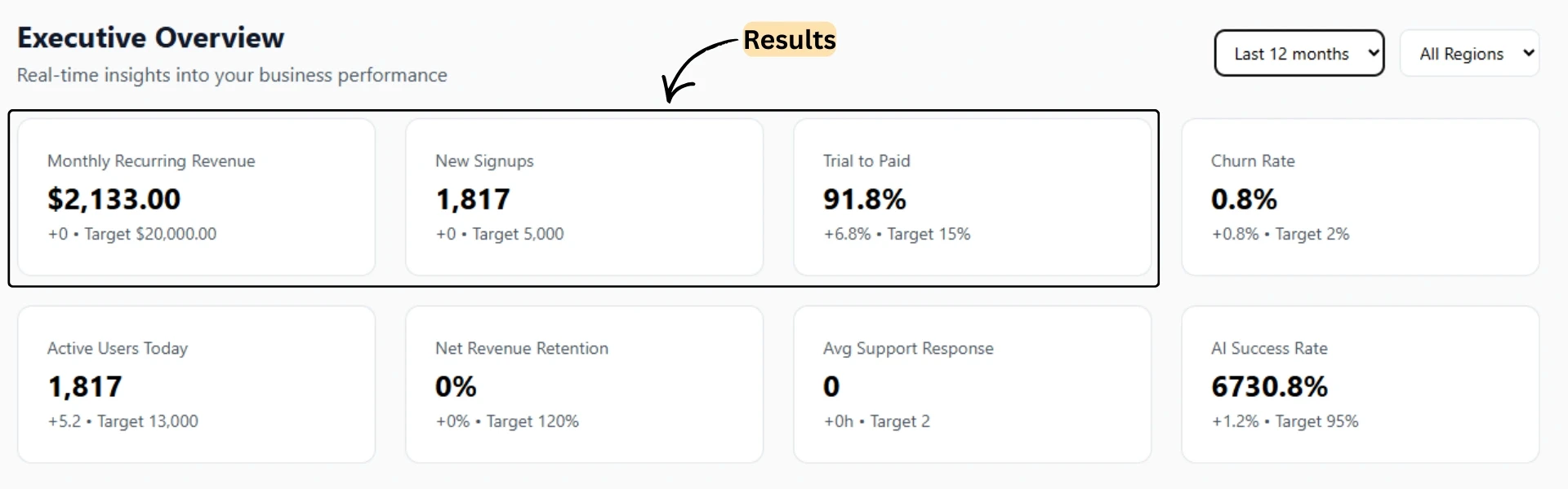 The platform has 1,817 new signups and an impressive 91.8% trial-to-paid conversion rate! The monthly recurring revenue is at $2,133, and the AI success rate is an amazing 6730.8%. Plus, active users are looking good at 1,817.