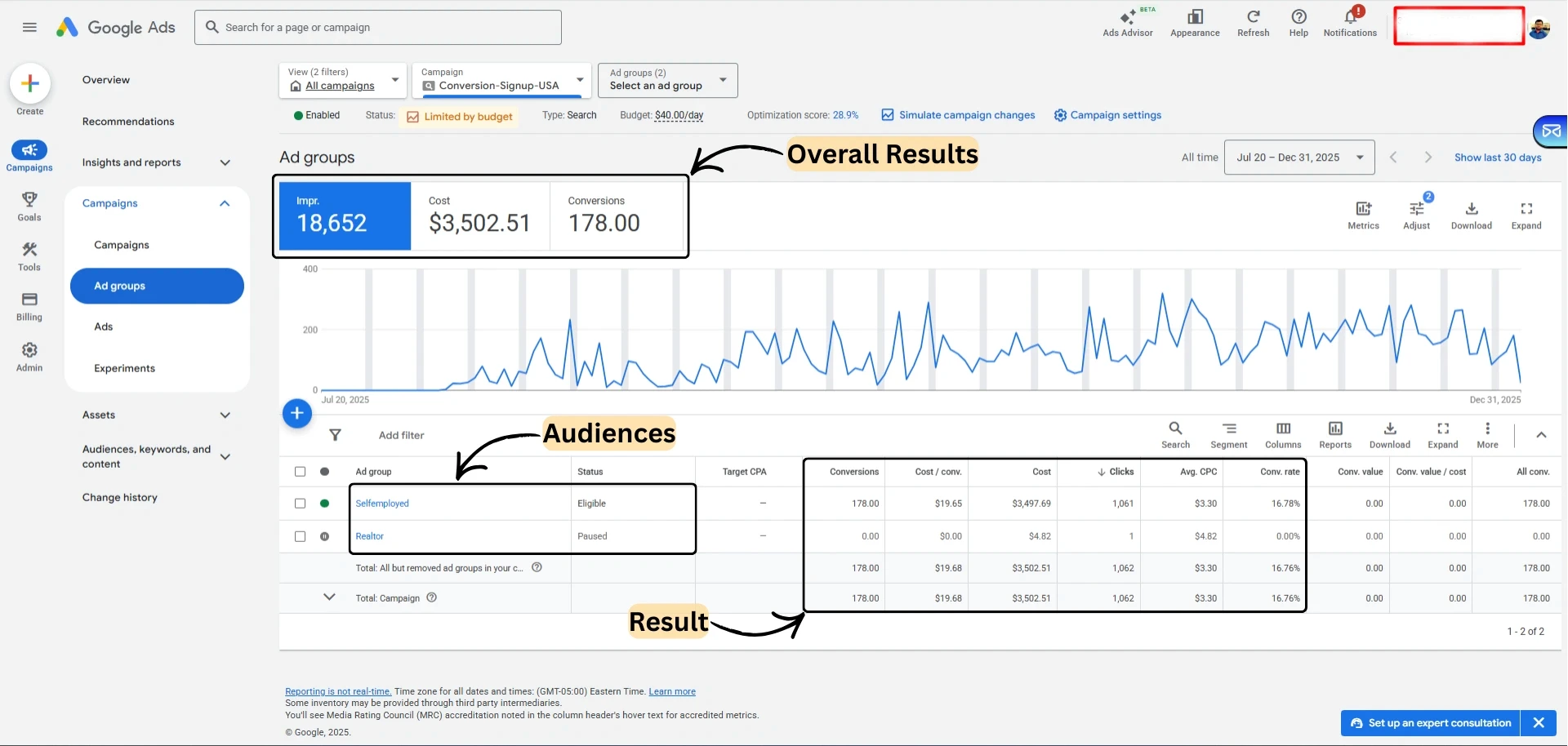 In Meta ads, we started retargeting those who previously visited our website and self-employed individuals who fit within the targeted interest demographic. Performance of the 7 ad copies was tested and the highest performing copy was a UGC style, which continues to deliver good results. Testing interest-based and broad audience targeting was done and the broad audience targeting was more effective, resulting in a better cost per outcome.