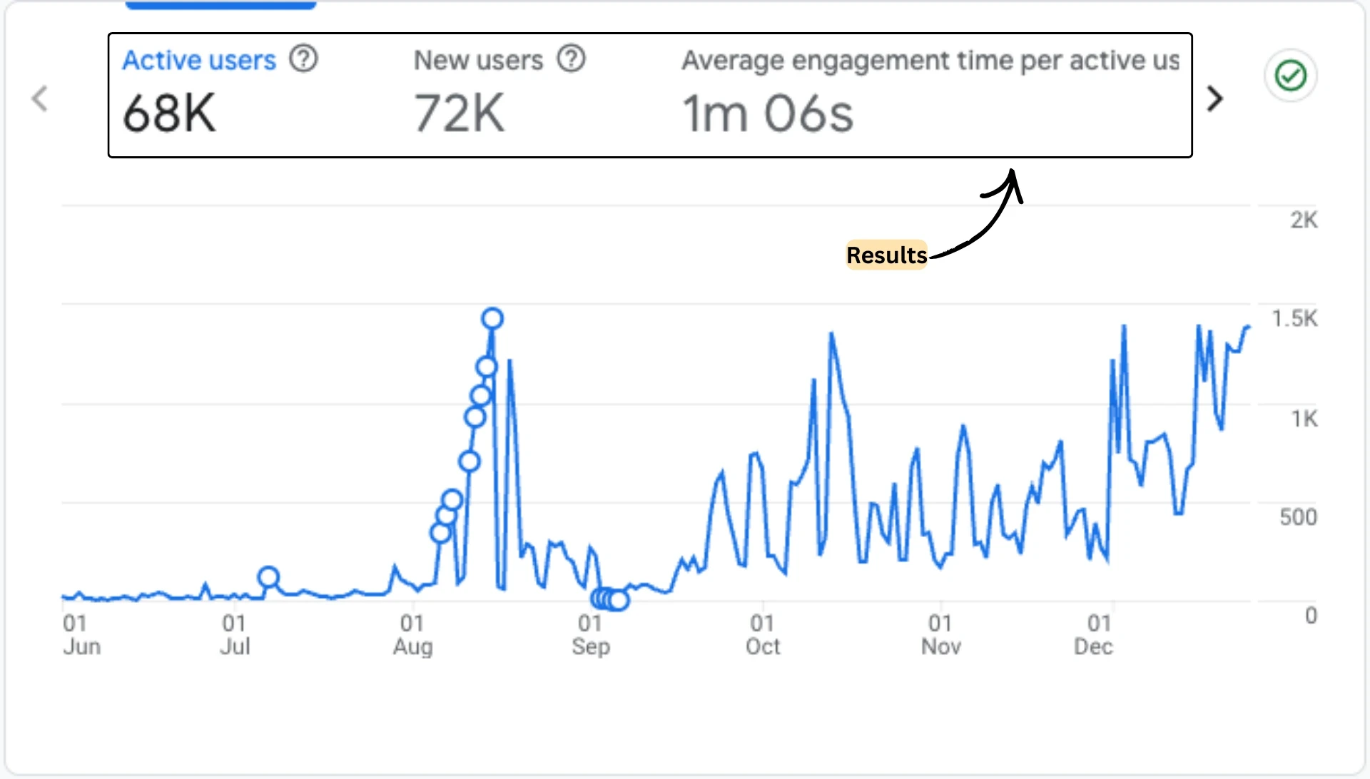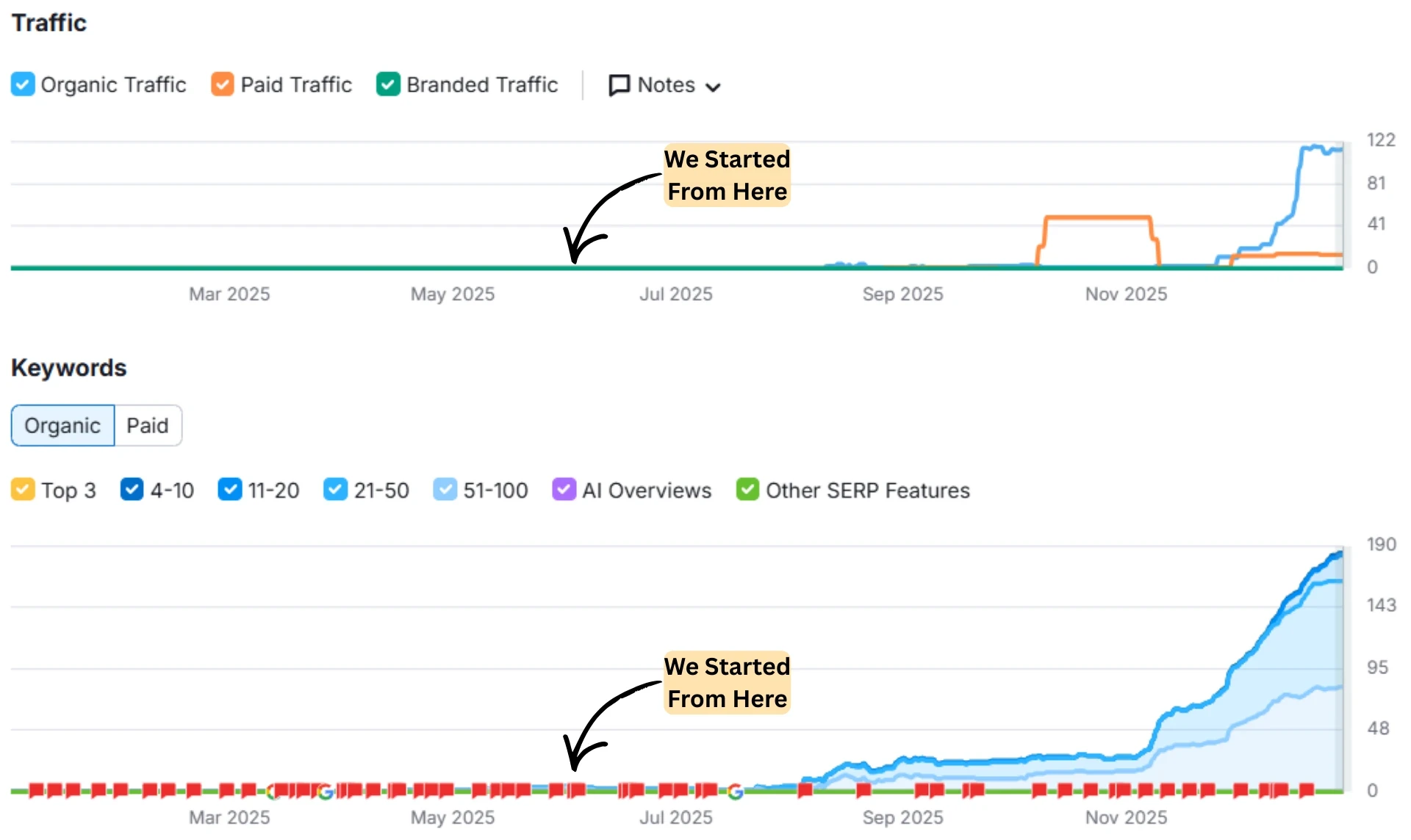 Total keyword rankings increased by 4,525% from 4 keywords in June to 185 in late December. During this time, organic daily traffic increased from almost zero to 114 visitors.