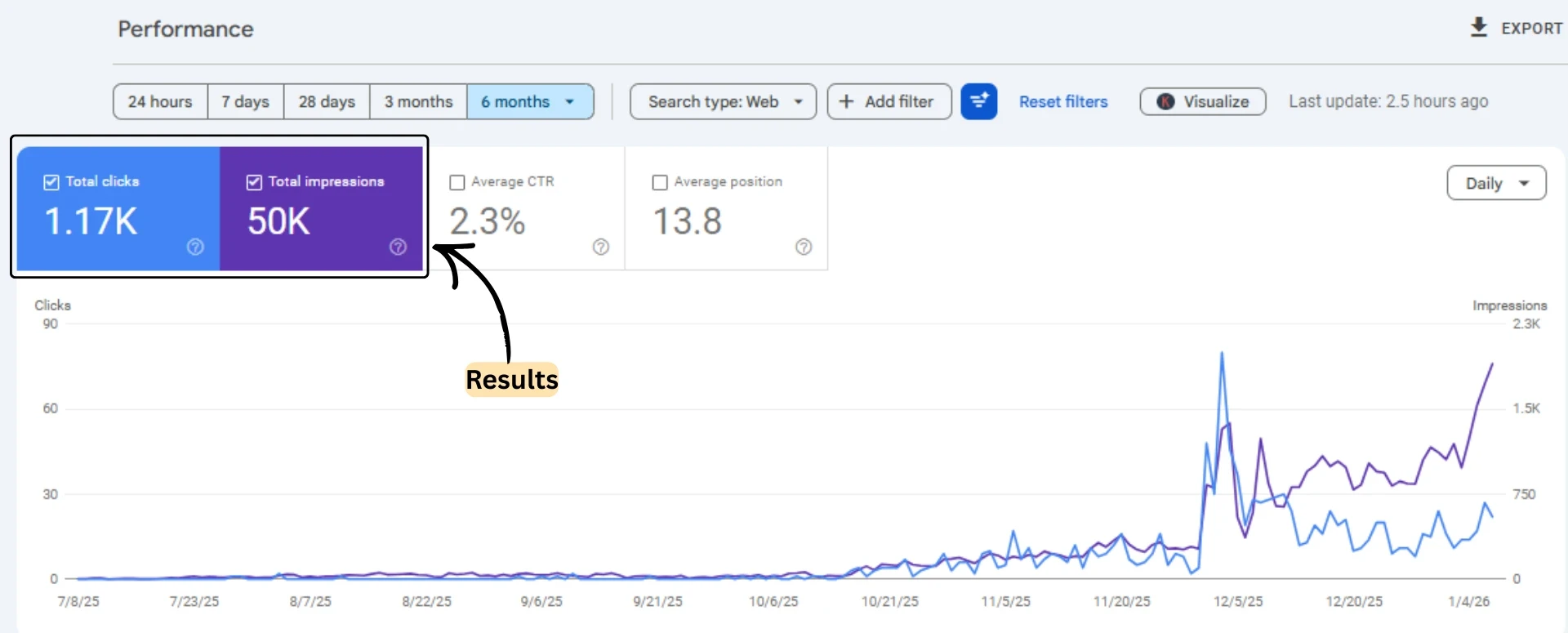 Total impressions increased from about 14 to 2000 from June 1 to the end December, an increase of roughly 50k. In the same period, total daily clicks increased from 0 to 34