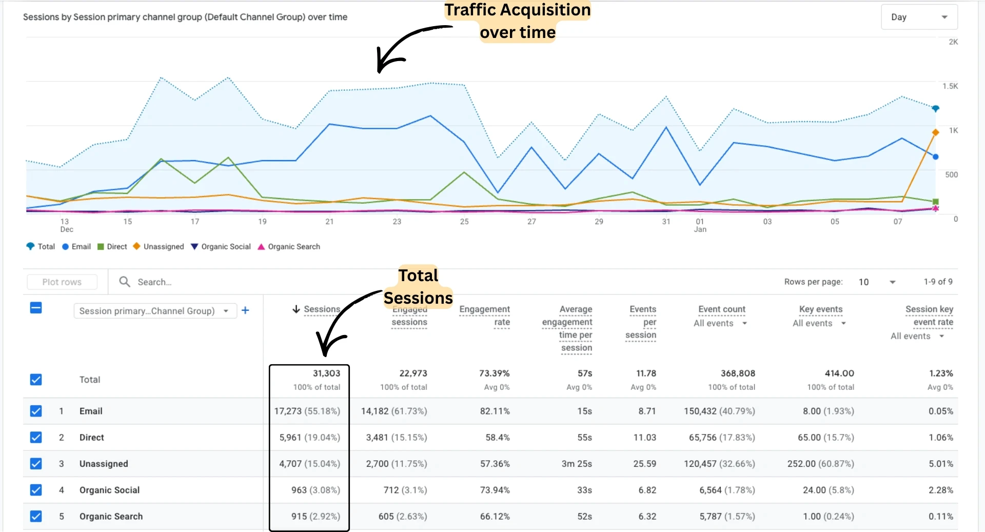 Over time, email emerged as the top channel, according to the traffic acquisition data from GA4.